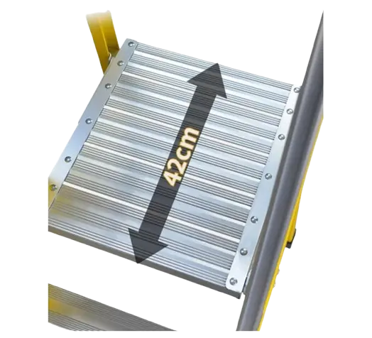 Gracias a su amplia plataforma superior, de 42 cm de largo, permite trabajar en altura por largos periodos de tiempo. Sus peldaños anchos permiten una subida muy segura y estable. La Escalera de Tijera Fibra de Vidrio y Aluminio 5 Escalones y Plataforma, puede ser utilizada para una amplia variedad de actividades en altura, ya sea en el hogar o en entornos profesionales. Su diseño robusto y liviano la hace ideal para tareas como cambio de ampolletas, procesos de limpieza de paredes y techos, pintura en secciones inaccesibles desde el suelo. Gracias a su peso reducido, es transportable fácilmente en largas distancias, o entornos complejos como es subterráneos de edificios, azoteas, interior de Caja Escala, etc.