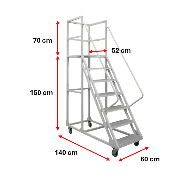Gracias a su amplia plataforma superior, de 52 de Ancho y 60 cm de largo, permite trabajar en altura por largos periodos de tiempo. Sus peldaños anchos permiten una subida muy segura y estable. La Escalera Tipo AVION con Plataforma de 1,5 mt y 7 Peldaños, puede ser utilizada para una amplia variedad de actividades en altura, está Diseñada Específicamente para Trabajos en Pasillo angostos, Bodegas, Bibliotecas, y en general, en todo Espacio de Almacenaje de Productos en Estanterías, Racks o Muebles de Gran Altura, o varios Niveles.